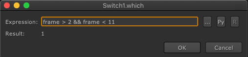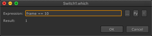 Take the muzzle flash scenario above, if we want the muzzle flash to turn on on frame 10, we can enter this expression on the switch node: