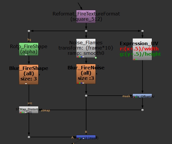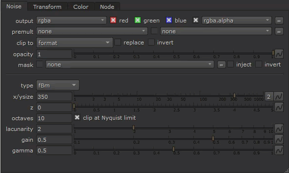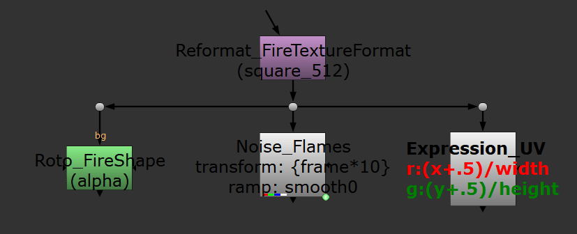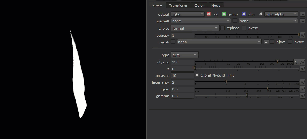 Next, create a noise node and connect it to the reformat node, we’ll be using this node to drive the look and feel of our flame texture.