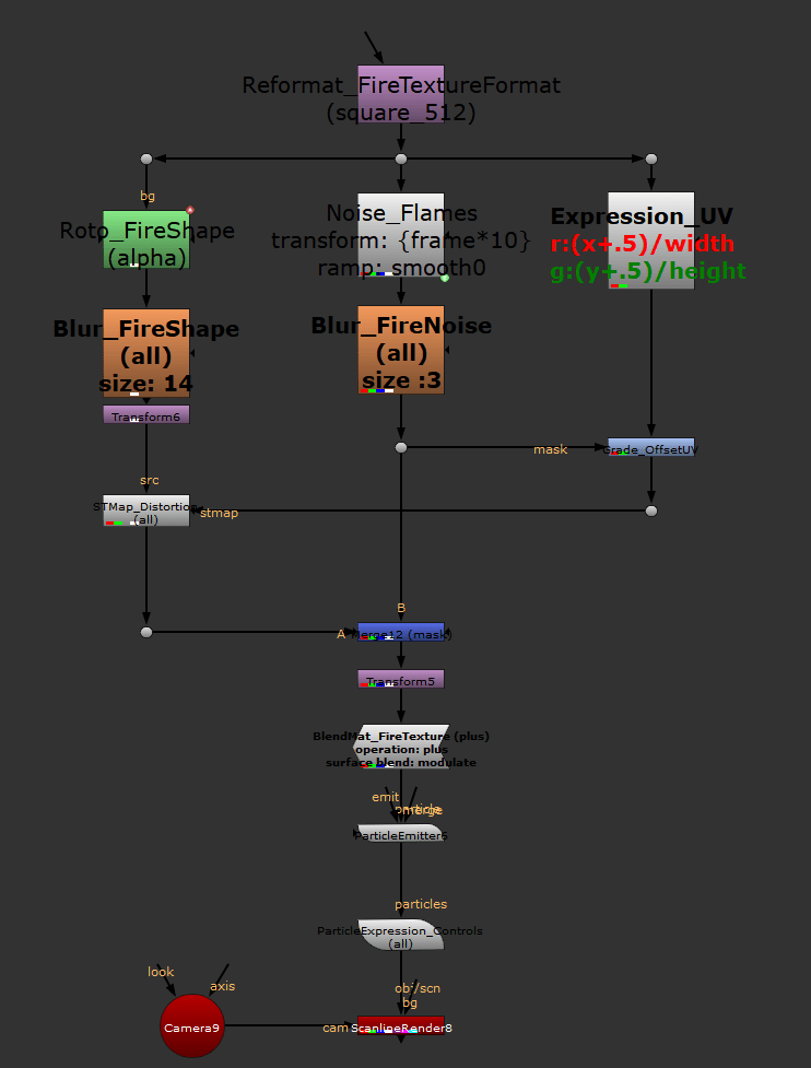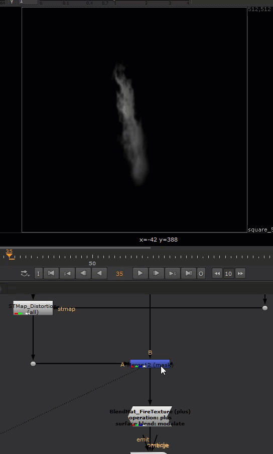Flames should accumulate in brightness, so that the core will be brighter than the edges. To achieve this, we set the “operation” of our BlendMat node to “plus“, and also set the “surface blend” to “modulate“.