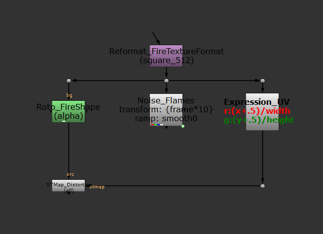 Create a STMap node, connect its “src” input to the roto node, then connect the “stmap” input to our UV map (expression node), and finally set its UV channel to “rgb”.