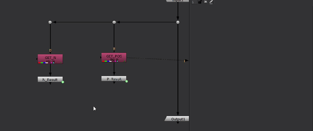 Create two shuffle nodes off to the side, and connect them to the Input node. We’ll use these two nodes to sample the position and normal data. Name them “GET_POS” and “GET_N“.